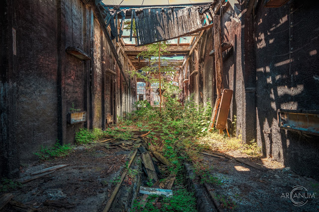 Once on the premises, we didn't run into any problems and were able to take our time to explore all the remaining buildings of the old railway repair factory. It had been really dry the weeks before, but there was still beautiful green growth all over - outside of the buildings as well as inside. The old factory was in its final stages of decay. A lot of the roofs were already gone, others bravely fought against their collapse, and yet others already had collapsed, but were hanging by a thread, so to speak, to form a kind of tunnel for us to walk through.